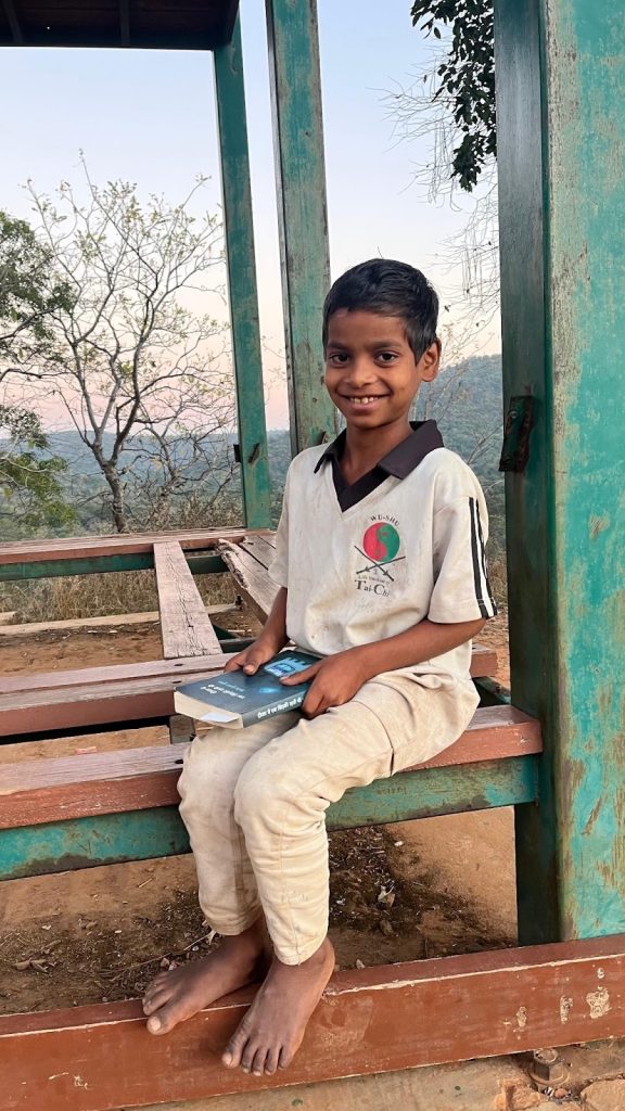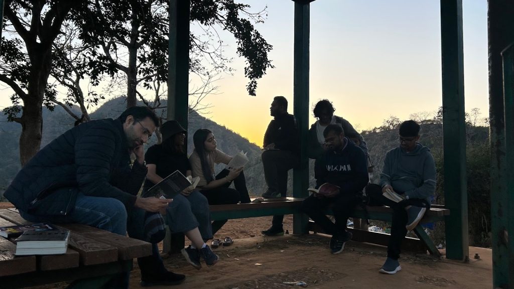 We are surrounded by even bigger mountains on one side and the horizon on the other. No sign of anybody else as far as the eye can see. A couple of benches placed at precise locations giving you the best view of the surrounding forests and the sunset. After clicking a fair amount of pictures, and trying out our luck at the Echo Point, we move towards a watchtower overlooking the hills and sit around in a circle to have another reading session. Priya recites another poetry and Ankit follows it up with a suspenseful short from Ghost Stories of Shimla by Ruskin Bond. Priya catches Prince trying to read from a Vinod Shukla book and decides to entrust it to him – with the hope that the book might just change another life. And with this as the sun sets and it starts getting dark, we begin our descent discussing another variety of topics : the continuing horror script, monopolies in India, and animals that could probably be around us and the probability that they might attack. We reach the base where we pay Prince his price and he disappears into the darkness. While we cross the acupuncture stream again, we are still trying to figure out if Prince was real or just a figment of our imagination. He came out of nowhere, showed us our path and disappeared when his job was done. Perhaps he was our guardian angel? Maybe a forest spirit that manifested a human form to show us its wonders? Or maybe just a friendly ghost – like the one from the Ruskin Bond book? We’ll never know, but we are just glad that he appeared when we needed him the most.