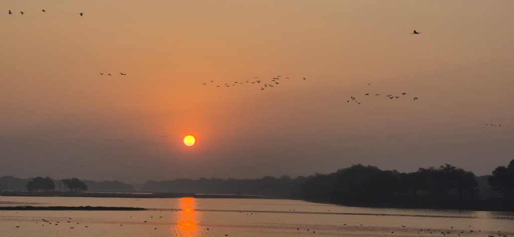 Orange hued Sunrise with bird’s chirping and lakeview,